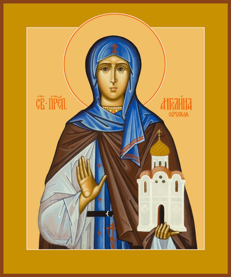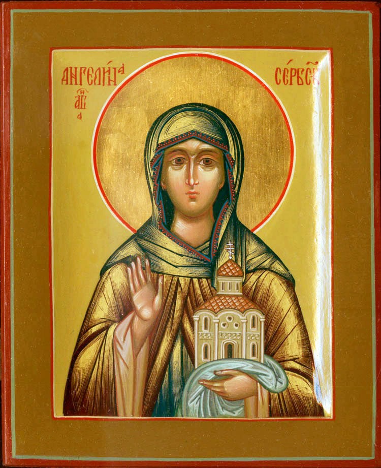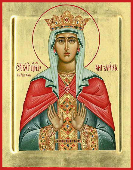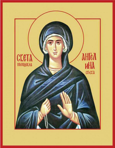 Дочь князя Георгия Албанского и супруга Стефана, короля Сербии, святая Ангелина претерпела изгнание вместе со своим мужем и разделила все трудности жизни в Албании и Италии. Двух сыновей своих, святых Максима и Иоанна, воспитала в духе истинно христианском. По смерти супруга, приняв монашеский постриг, святая Ангелина посвятила себя молитве, благотворительности и храмостроительству. Верная жена, добрая мать и совершенная христианка, она воистину заслужила имя «матери Ангелины», которым ее наградил народ. Ее чудотворные мощи сохраняются вместе с мощами ее праведного супруга – святого Стефана и их благочестивых детей Максима и Иоанна в монастыре Крушедол. Святая Ангелина обрела покой и вечную жизнь в начале шестнадцатого столетия.