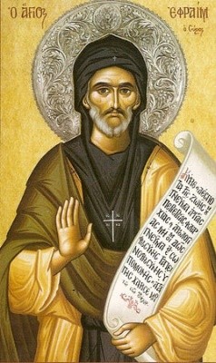 тропарь, глас 8. Слезами твоих источников пустыни безъчадное напоил еси и, еже из глубины, воздыхании во сто труды уплодоносил еси - и бысть светильник вселенней, сияя чудесы, Ефреме-отче наш, моли Христа-Бога спастися душам нашим. Слава, и ныне. Иже нас ради Рождеи Ся от Девы и распятие претерпев, Благии, Испровергии смертию смерть и восресение Явлеи яко Бог - не презри, их же созда рукою Своею, - яви человеколюбие Свое, Милостиве, - приими рождьшую Тя - Богородицу, Молящуюся за нас, - и спаси, Спасе наш, люди согрешьшыя.Канон, поем в глас 6. Песнь 1, ирмос: Яко по суху ходив израиль по бездне стопами, гонителя фараона видя потопляема - Богу победную песнь поем, вопияше.ЗАПЕВ. Преподобне отче Ефреме, моли Бога о нас. Евъфратъским одождением - твоими молитвами душю мою напой, изъсохшую зноем страстей. И слово ми вдохни, твой восхваляющу праздник, преблаженне.ЗАПЕВ. Свет мысленыи облистал еси - светло явился еси солнце: добродетельми светолучными и учении добротами, Ефреме, озаряя верных все исполнение.СЛАВА. Струями слез пламень страстей погасив, был еси сосуд честен, Ефреме, Святаго Духа - источник источая учением, Богоблаженне.И НЫНЕ. Нетленно Слово во утробе приимши, родила еси - Избавляющаго от тли Тому служащыя присно, Мати-Дево, Чистая, Двери - воистину - Живота.Песнь 3, ирмос: Несть Свята, якоже Ты, Господи, Боже мой, - Вознесыи рог верных Си, Блаже, и Утвердивыи их на камени исповедания Ти.ЗАПЕВ. Тины всякия страстныя себе очищь - явил ся еси приятилище добродетелем, воистину, и сосуд въмещен дарованиям Святаго Духа.ЗАПЕВ. Никакоже сна очима подав - храм явил ся еси Святей Троице и Премудрости сокровище, мир обогащая златозарными учении, блаженне.СЛАВА. Познавает другии Ефрат Христова честная Церкви: златыми течении напояюща мудрых учения водами - и тварь всю напояюща.И НЫНЕ. Во двою естеству - единыи от Святыя Троицы - от чистых Твоих кровий воплощь Ся, Боголепно пройде, яже от Адама спасая благостию, О, Пречистая.седален, глас 5. Сокровище Премудрости тайнам Христовем, чашю Божественаго умиления - воспоем вернии в памяти его: тезоименно бо всегда сердца верных веселит утешении Божествеными Ефрем, яко делатель и таиник Господним откровением. Слава, и ныне. Богородичен: Теплая Предстательнице, и Непобедимая, Упование известное и непостыдное, Стено и Покрове, и Пристанище притекающим Ти, присно Дево, Чистая, - Сына Своего и Бога моли со Ангелы Мир даровати мiрови и спасение и велию милость. Кресто-Богородичный: Крестом Сына Твоего, Богоблагодатная, идольская лесть вся упразднися и бесовъская крепость попрана бысть, сего ради вернии подолгу Тя присно поем и благословим и, Богородицу - воистину! - исповедающе, величаем.Песнь 4, ирмос. Христос мне - Сила, Бог и Господь - честная Церкви Боголепно зовет, вопиющи от совести чисты, о Господе празднующи.ЗАПЕВ. Сила глаголом твоим протече весь мир, высоко творя сиянием смирения, отгоня ослепление душам, блаженне.ЗАПЕВ. Непорочно прошел еси житие, слезами себе омывая - и Судии всех Пришествие написуя словесы мудрыми, Богоявленне, досточюдне.ЗАПЕВ. Видев твоего смирения преславную высоту Господь - дарует тебе слово высокотворно, имже ересем лютая возношения смиришася.СЛАВА. Укрепль себя благодатию Вседержителя - ополчи себя къ началом бесовъским, отче, - и победил еси, о нас моляся тепле, восхваляющих тя.И НЫНЕ. Яко Боже