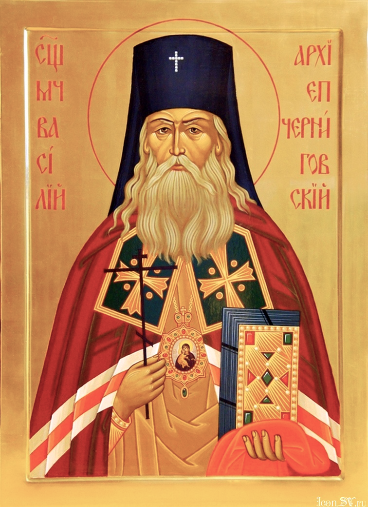 Священномученик Василий, архиепископ Черниговский и Нежинский (в миру Богоявленский Василий Дмитриевич) родился в февраля 1867 года в селе Старое Сеславино Тамбовской губернии в семье священника. В 1888 году он окончил Тамбовскую Духовную Семинарию. После рукоположения в сан иерея в 1890 году отец Василий служил в церкви села Овсянки Тамбовской епархии. В 1896 году он поступил в Казанскую Духовную Академию, которую закончил в 1900 году. В 1907 году отец Василий был удостоен степени магистра богословия за диссертацию на тему: «Вторая книга Маккавейская. Опыт исагогического изследования». В 1908 году, после кончины супруги, он принимает монашеский постриг и вскоре назначается ректором Черниговской Духовной Семинарии с возведением в сан архимандрита. В 1909 году состоялась его хиротония в епископа Сумского, викария Харьковской епархии. На Черниговской кафедре Владыка состоял с 12 мая 1911 года до 6 мая 1917 года. В 1917 году, по распоряжению Временного Правительства были уволены все члены Святейшего Синода, кроме архиепископа Финляндского Сергия (Страгородского). В их числе был и Владыка Василий, который, будучи обвинён «в приверженности старому строю», был отправлен на покой как «не соответствующий революционному духу времени». Он был переведён в Николаевскую Теребенскую пустынь Тверской епархии; затем некоторое время управлял Московским Заиконоспасским монастырём. Святитель участвовал в деятельности Поместного Собора Русской Православной Церкви, откуда в 1918 году был командирован в Пермь расследовать арест и убийство священномученика архиепископа Андроника (память 7 июня). После произведения следствия Владыка с другими членами комиссии выехал из Перми, однако их поезд был остановлен между Пермью и Вяткой. В вагон ворвались красноармейцы, убили членов комиссии, а тела их выбросили из поезда. Самого Владыку сбросили с Камского моста в реку. Произошло это 14 (27 н. ст.) августа 1918 года. Тело Владыки похоронили местные крестьяне, но когда к его могиле начались паломничества, большевики выкопали тело священномученика и сожгли его. Причислен к лику святых Новомучеников и Исповедников Российских на Юбилейном Архиерейском Соборе Русской Православной Церкви в августе 2000 года для общецерковного почитания.