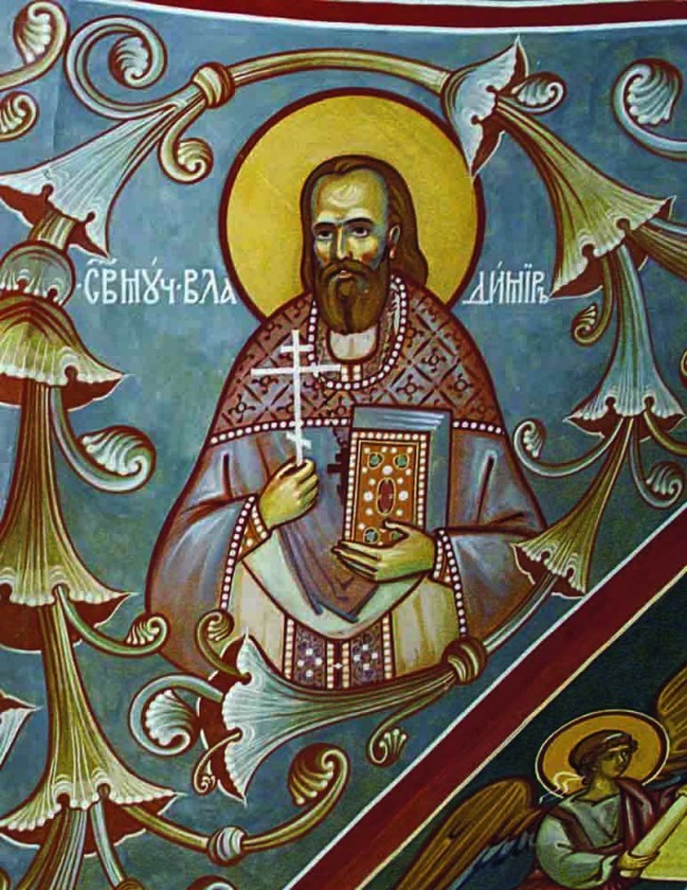 Христовою верою из детска утвержденный / и живот свой проповедованию Слова Божия посвятивый, / истину в Церкви Православной обретший / и к пастырскому служению Божиим смотрением призванный, / в дни гонений семьи верных окормлял еси, / прещений от безбожных не убоявся. / Тем же и пострадал еси даже до крове, / отче священномучениче Владимире, / моли Милостиваго Бога // спастися душам нашим.