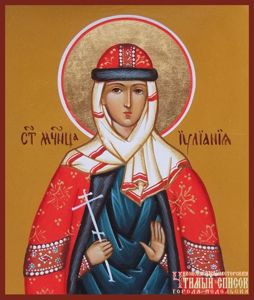 Ангелов сожительница и страстотерпцем сопричастница быти сподобилася еси, всечестная Иулиание, ангельскую бо чистоту от пелен сохранила еси и тоя ради мученическую кончину доблественно восприяла еси: и ныне со ангельскими лики и мучеников сонмы Престолу Всесвятыя Троицы предстоящи, моли о помиловании нас, приносящих ти похвальная сия: Радуйся, даров духовных исполненная. Радуйся, венцем мученическим украшенная. Радуйся, непоколебимый во искушениях терпения столпе. Радуйся, твердое во обстояниях мужества основание. Радуйся, добродетели неувядаемыи цвете. Радуйся, лозы Христовой многострадальная розго. Радуйся, благочестия честное прозябение. Радуйся, чистоты доброто и похваление. Радуйся, голубице, крыла позлащенная имущая. Радуйся, теми в райская обители возлетевшая. Радуйся, Иулиание, благоверная княгиня целомудренная.