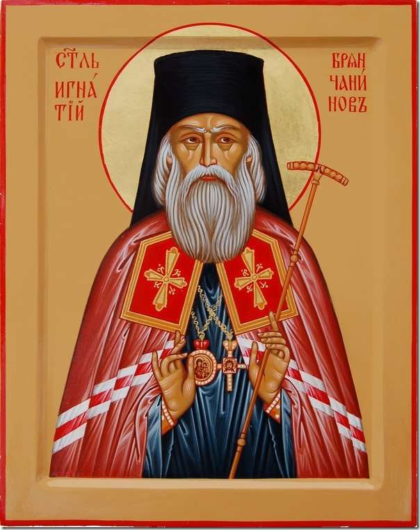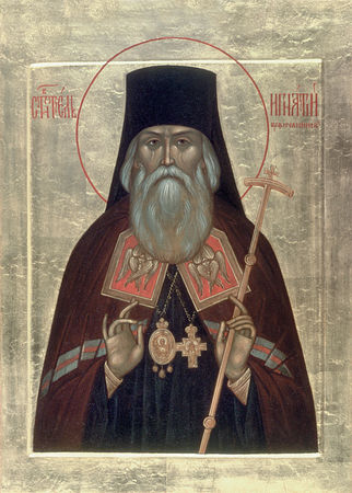 О великий и пречудный угодниче Христов, святителю отче Игнатие! Милостиво приими молитвы наша, с любовию и благодарением тебе приносимыя! Услыши нас сирых и безпомощных, к тебе с верою и любовию припадающих и твоего теплаго предстательства о нас пред Престолом Господа Славы просящих. Вемы, яко много может молитва праведника, Владыку умилостивляющая. Ты от лет младенческих Господа пламенно возлюбил еси и Ему Единому служити восхотев, вся красная мира сего ни во чтоже вменил еси. Ты отвергся себе и взем крест твой, Христу последовал еси. Ты путь узкий и прискорбный жития иноческаго волею себе избрал еси и на сем пути добродетели великия стяжал еси. Ты писаньми твоими сердца человеков глубочайшаго благоговения и покорности пред Всемогущим Творцом исполнял еси, грешников же падших мудрыми словесы твоими в сознании своего ничтожества и своея греховности, в покаянии и смирении прибегати к Богу наставлял еси, ободряя их упованием на Его милосердие. Ты николиже притекавших к тебе отвергал еси, но всем отец чадолюбивый и пастырь добрый был еси. И ныне не остави нас, усердно тебе молящихся и твоея помощи и предстательства просящих. Испроси нам у человеколюбиваго Господа нашего здравие душевное и телесное, утверди веру нашу, укрепи силы наша, изнемогающия во искушениих и скорбех века сего, согрей огнем молитвы охладевшая сердца наша, помоги нам, покаянием очистившимся, христианскую кончину живота сего получити и в чертог Спасов преукрашенный внити со всеми избранными и тамо купно с тобою покланятися Отцу и Сыну и Святому Духу во веки веков. Аминь.