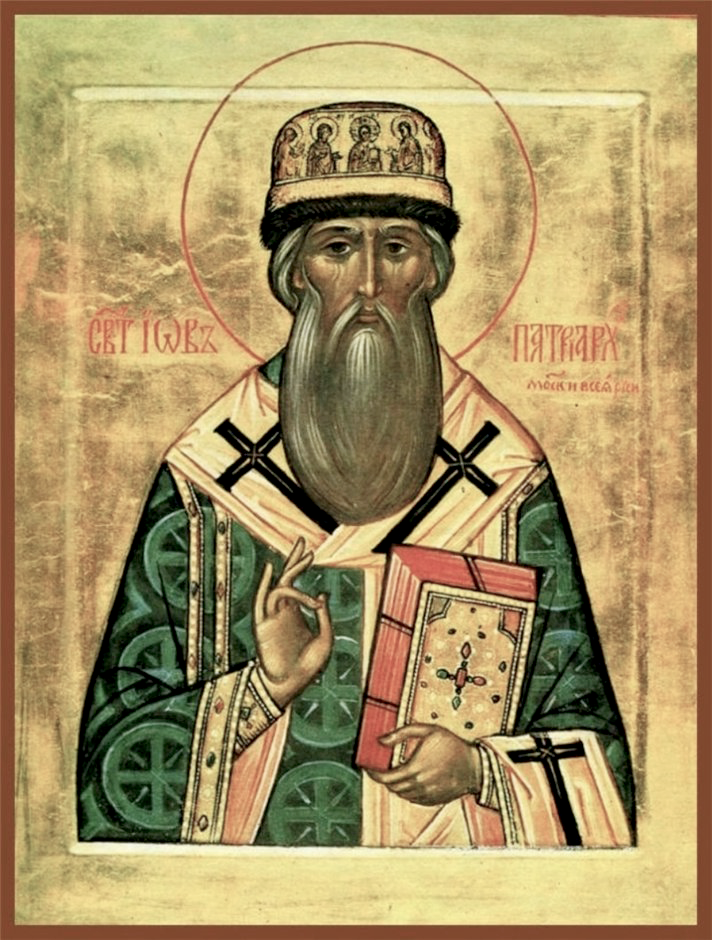 Патриарх Иов (в миру Иоанн) родился в 30-е годы ХVI в. в семье посадских людей города Старицы Тверской губернии. Отроческие годы прошли в Старицком Успенском монастыре, куда отец отдал его на воспитание. В этой обители он принял монашество с наречением имени Иов. Около 1569 года обитель посетил царь Иоанн Грозный, инок Иов привлек к себе его благосклонное внимание и вскоре был возведен в сан архимандрита. В 1571–1572 годах он – настоятель Симонова Успенского монастыря в Москве, в 1575–1580 годах – Новоспасского. В 1581 году архимандрит Иов был рукоположен в сан епископа Коломенского. В 1586 году стал архиепископом Ростова Великого и в 1587 году – митрополитом Московским. 23 января 1589 г. при участии патриарха Константинопольского Иеремии состоялось наречение, а 26 января – торжественное поставление митрополита Иова в патриарха Московского и всея Руси.