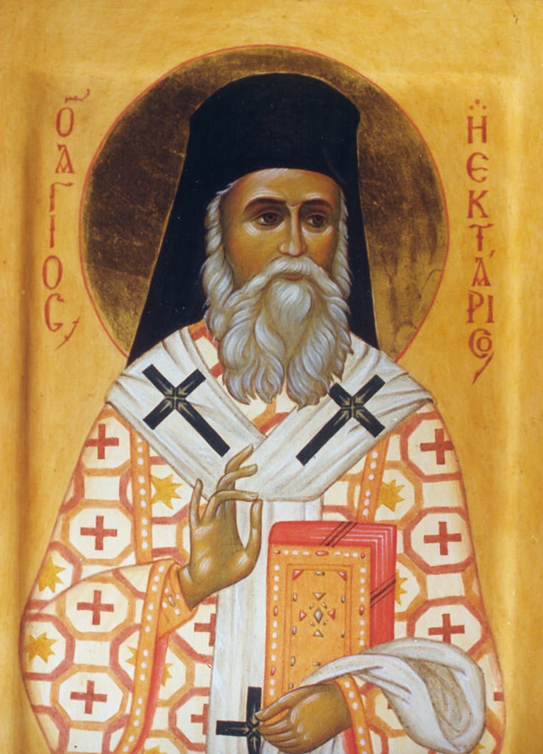 Преподобнически пожив, яко мудрый иерарх,/ прославил еси Господа/ добродетельным житием, Нектарие преподобне./ Темже, Утешителя прославлен силою,/ Божественными мощми твоими,/ демоны отгониши и болящия исцеляеши,/ верою приходящия ти.