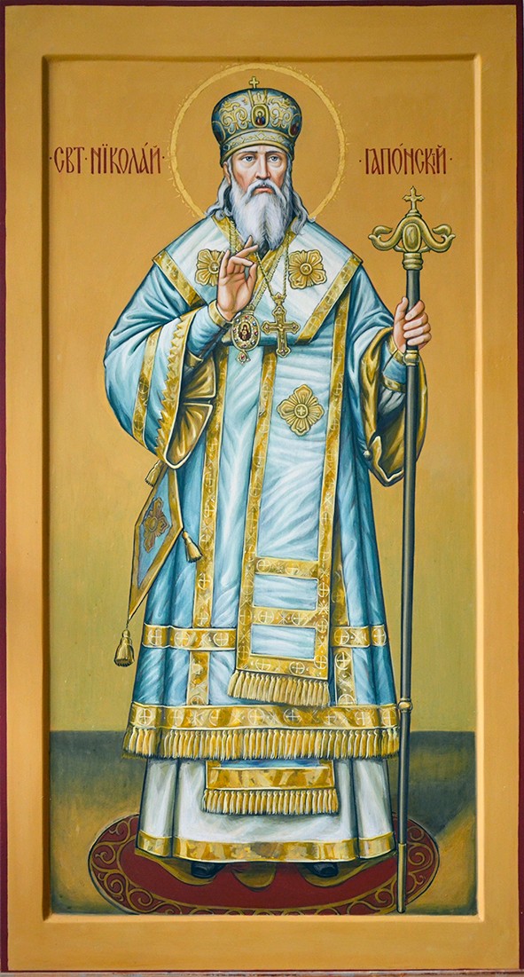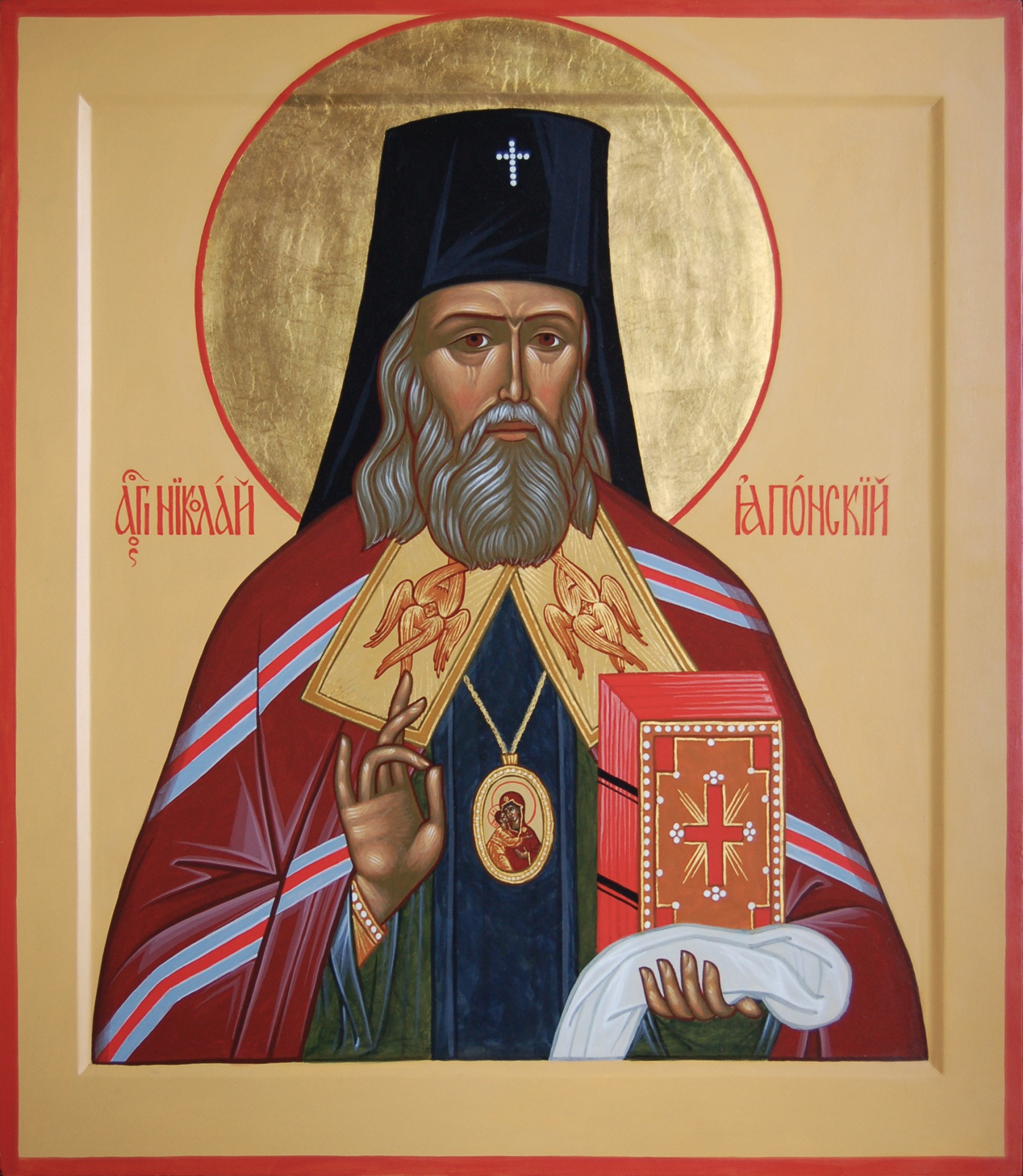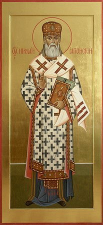 Яко апостолом сопричастника в трудех и возмездиих/ Церковь тя с любовию почитает,/ святителю отче Николае равноапостольне./ Положив бо многими подвиги начало Православия в Японии язычестей,/ умножил еси в ней чада спасения,/ и по кончине прият тя Бог во обители апостол Своих по достоянию./ Сего ради молим тя/ молися Господеви пребыти и в предняя делу твоему незыблему на веки,/ и ввестися в лоно Церкве Православныя всем погибнути имущим,/ умиритися мирови/ и спастися душам нашим.