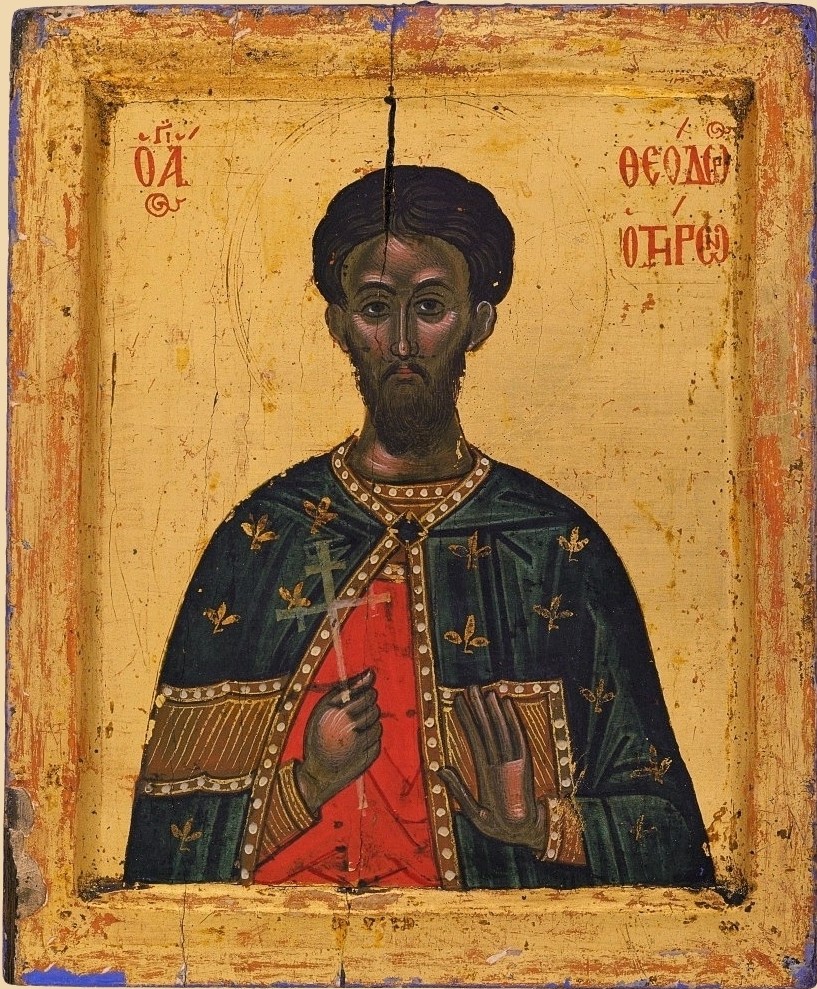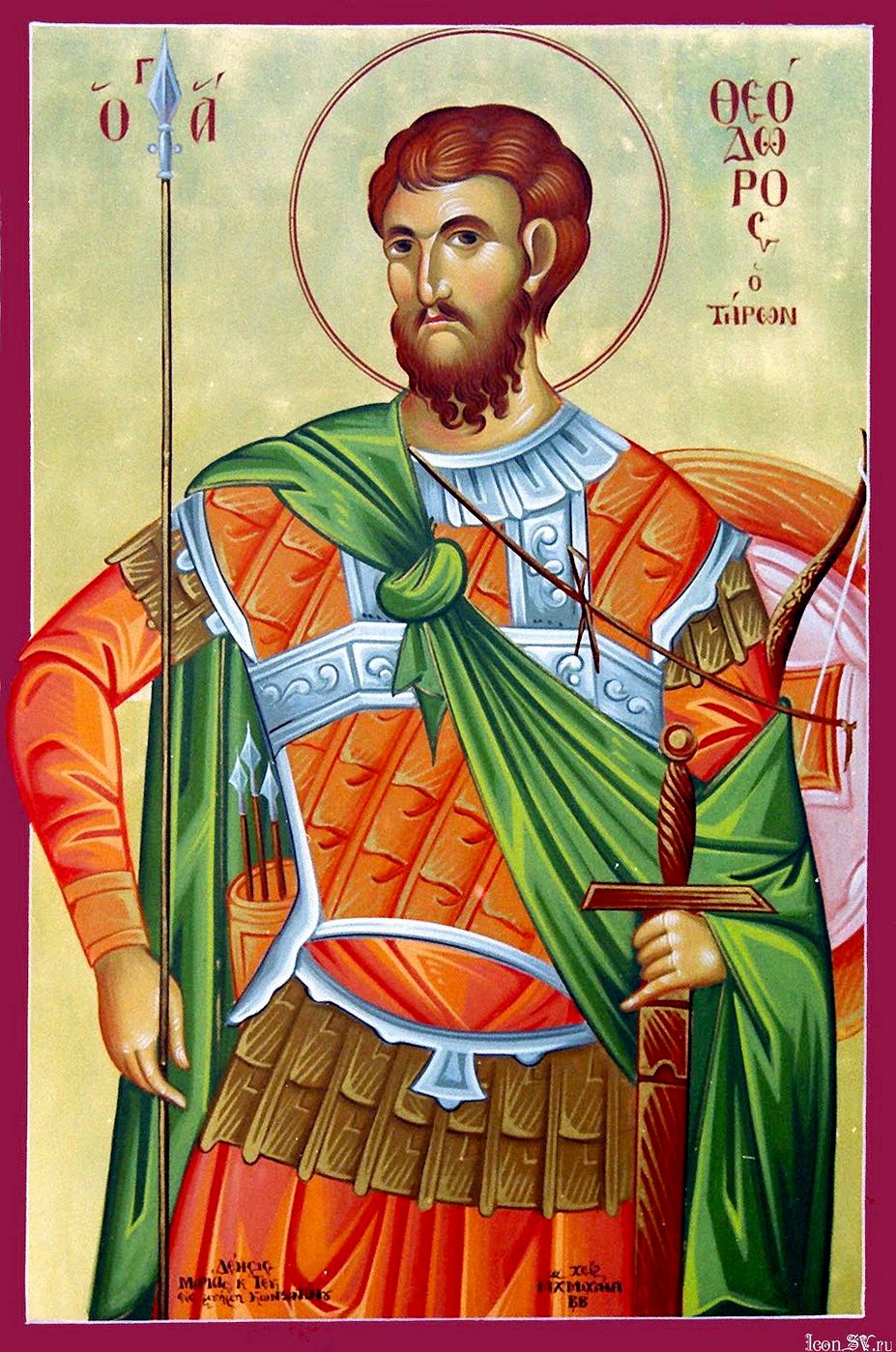 Святой мученик Феодор Тирон был воином в городе Аласии Понтийской области (северо-восточная область Малой Азии, тянувшаяся вдоль берега Понта Эвксинского, т. е. Черного моря), под начальством некоего Вринка. Его принуждали принести жертву идолам. Святой Феодор твердо во всеуслышание исповедал свою веру во Христа Спасителя. Начальник дал ему несколько дней на размышление, во время которых святой Феодор усиленно молился. Его обвинили в поджоге языческого храма и бросили в темницу на голодную смерть. Там ему явился Господь Иисус Христос, утешил и подкрепил его. Приведенный вновь к правителю, святой Феодор еще раз смело и безбоязненно исповедал свою веру, за что был предан новым истязаниям и осужден на сожжение. Мученик Феодор без трепета взошел на костер и с молитвой и славословием предал свою святую душу Богу.
