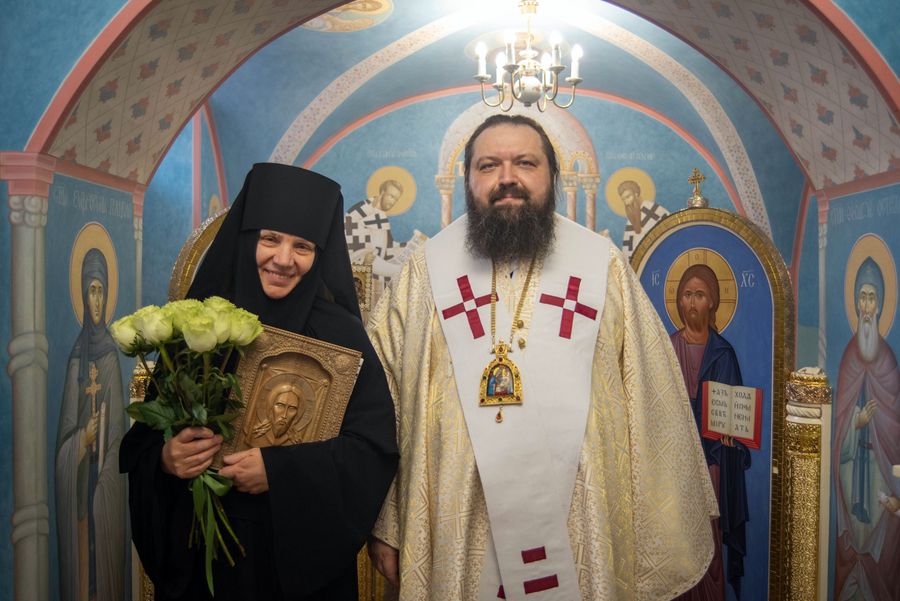 Затем архипастырь поздравил игумению Евпраксию с днем тезоименитства и на молитвенную память преподнес образ Спасителя и цветы, хор провозгласил имениннице многолетие.