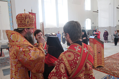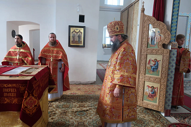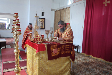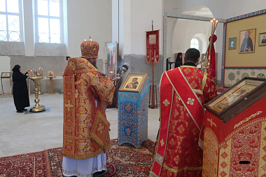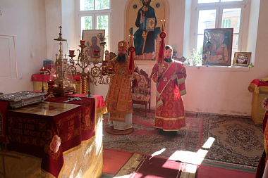Его Преосвященству сослужили благочинный Монастырского округа иеромонах Евфимий (Репьёв), руководитель епархиального Миссионерского отдела иерей Алексий Бессонов, клирики Скорбященского женского монастыря.