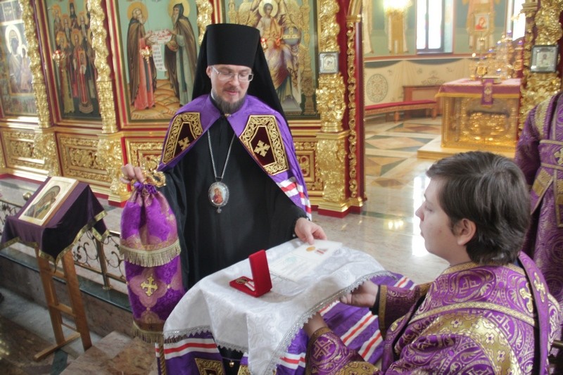 Его Преосвященству сослужили: секретарь епархии, настоятель собора протоиерей Александр Куликов; ключарь собора протоиерей Олег Кочубей; иеромонах Иов (Чернышев); руководитель Службы протокола иерей Сергий Бондарь; иеромонах Геронтий (Чудневич); руководитель Административного секретариата епархии иеромонах Марк (Шляхтин).