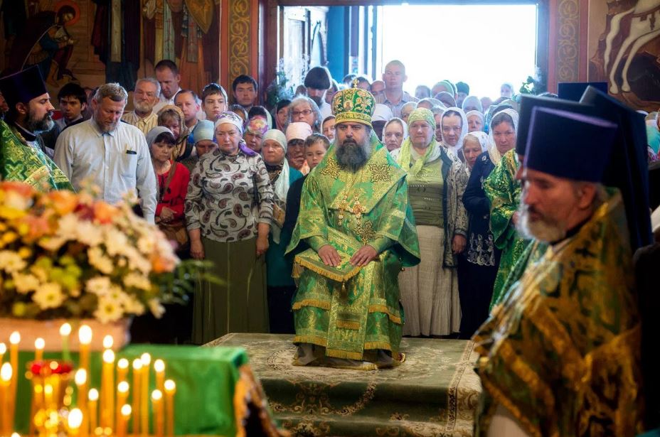 По окончании Литургии в честь престольного праздника духовенством был совершен крестный ход вокруг храма, после чего владыка Герман обратился к собравшимся с архипастырским словом.