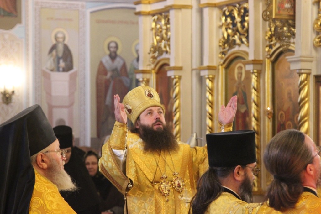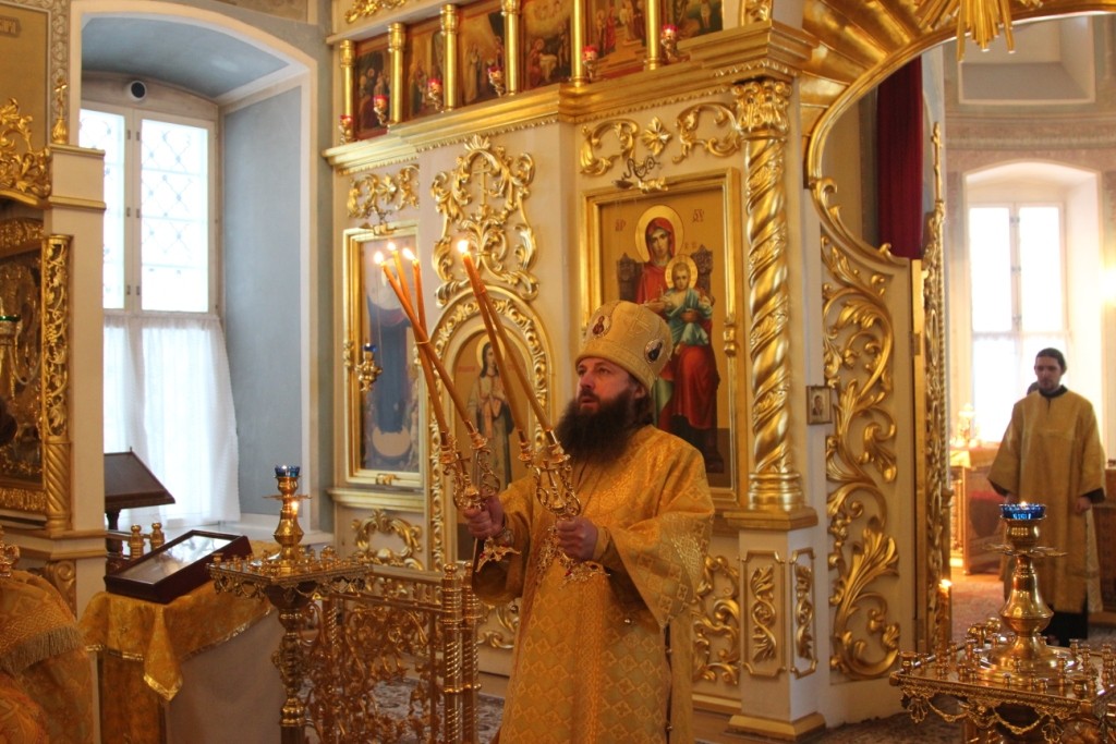 Его Преосвященству сослужили духовник Николо-Шартомского монастыя иеромонах Тихон (Захаров), клирики Успенского Дуниловского монастыря иеромонахи Леонтий (Севрук) и Венедикт (Челушкин).