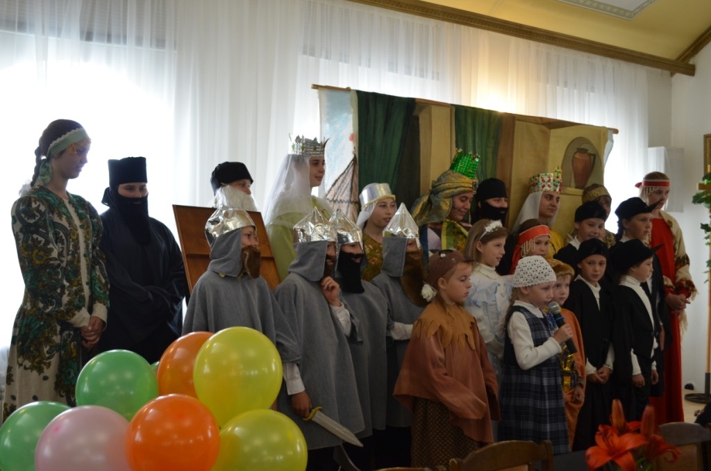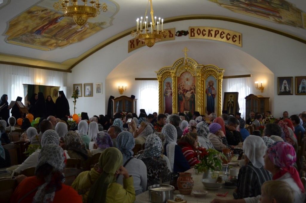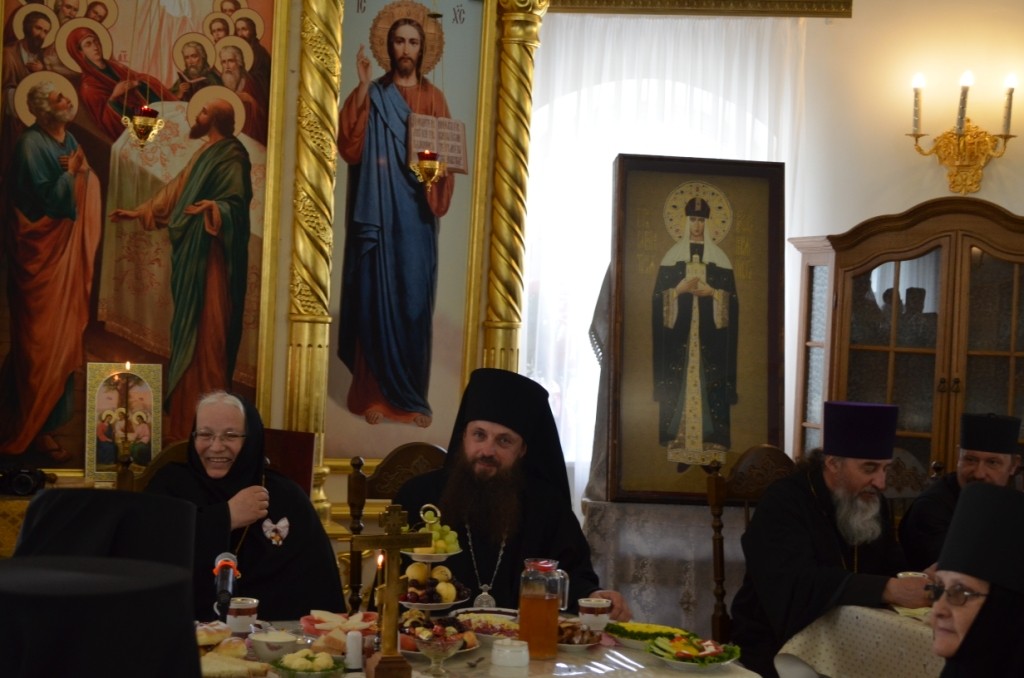 По окончании богослужения все паломники были приглашены на трапезу, во время которой матушку игумению поздравили сестры обители, исполнившие песнопения для всех гостей, и учащиеся Воскресной школы при монастыре, преподнесшие в подарок игумении Ольге спектакль, в основу сюжета которого было положено житие святой равноапостольной княгини Ольги.