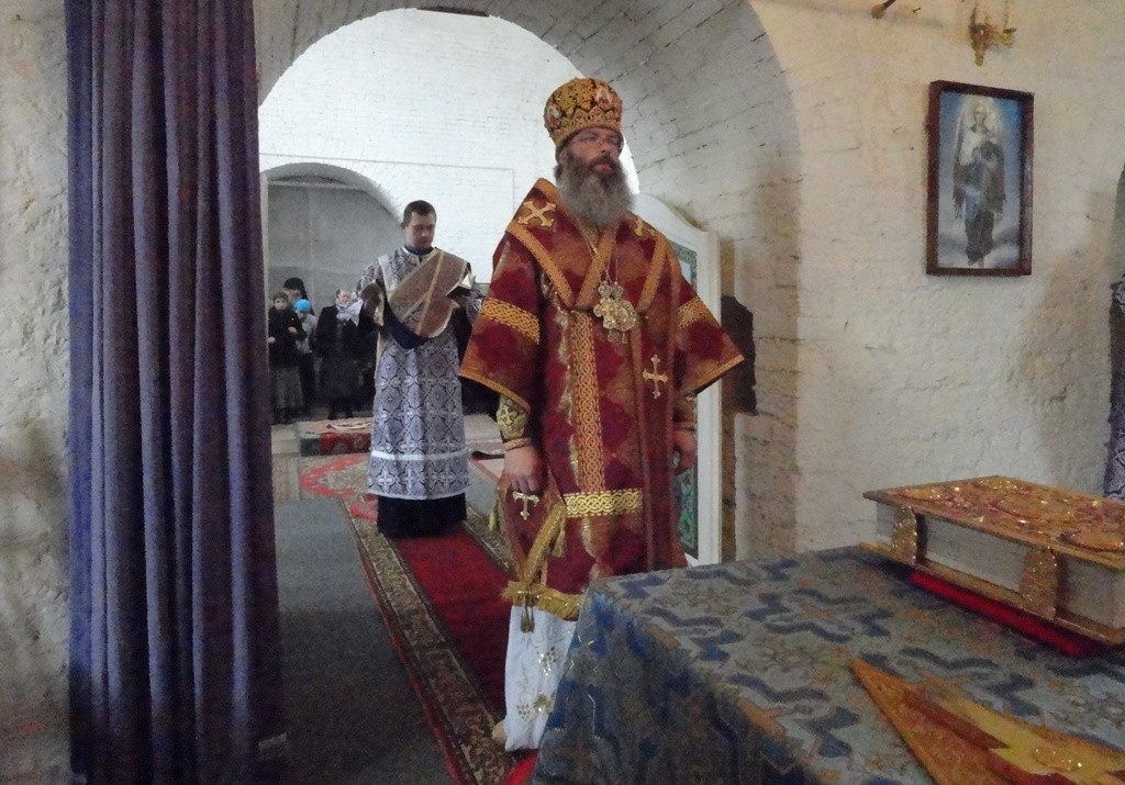 Его Преосвященству сослужили наместник монастыря иеромонах Арсений (Девятериков) и братия монастыря в священном сане.