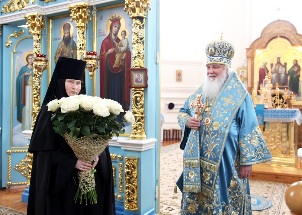 Игумении Арсении архипастырь адресовал особое поздравление по случаю отмечаемого ею 75-летия, а также 20-летия возобновления богослужебной жизни в Тюнинской обители. От лица всех членов Епархиального совета матушке настоятельнице была преподнесена икона Богоматери, святая просфора и букет цветов.
