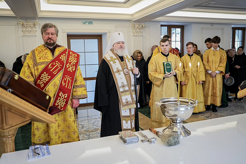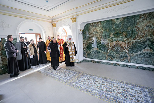 Владыка Кирилл в сопровождении духовенства и молящихся обошел и окропил помещения корпусов будущей святой обители святой водой.