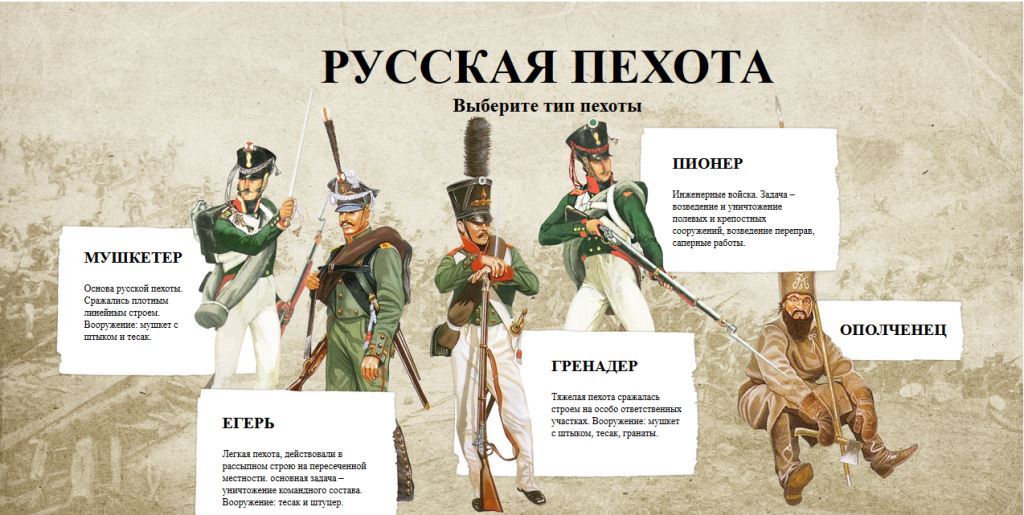 В квесте-викторине, посвященном 1812 году, командам сначала предлагается знакомство с родами войск в русской армии 1812 года, с типами пехотных, кавалерийских и артиллерийских частей: драгунами, егерями, кирасирами, фейерверкерами, гусарами и прочими. Познакомившись с формой и предназначением каждого из видов войск, можно выбрать себе соответствующую часть для того, чтобы вместе с ней пройти всю Отечественную войну 1812 года от Немана до Березины. Каждая из команд может выбрать либо пехоту, либо артиллерию, либо кавалерию и соответствующий вид части, относящийся к этому роду войск.