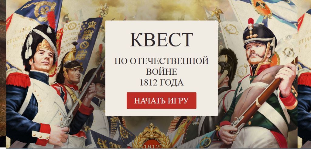 Квесты, которые теперь доступны на первой странице сайта http://museum-1812.ru/, были разработаны для интерактивного стола и рассчитаны, в основном, на школьников, посещающих музей, чтобы в них можно было играть, разбившись на команды. Однако вопросы викторин и видеоролики, песни, с которыми доведется столкнуться при прохождении квестов, могут быть интересны и взрослым, поэтому мы предлагаем играть в них всей семьей.