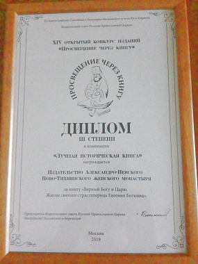 Книга издательства Александро-Невского Ново-Тихвинского женского монастыря Екатеринбурга «Верный Богу и царю» о святом Евгении Боткине заняла третье место на XIV конкурсе «Просвещение через книгу» в номинации «Лучшая историческая книга».