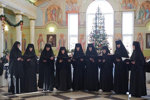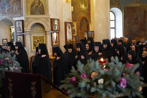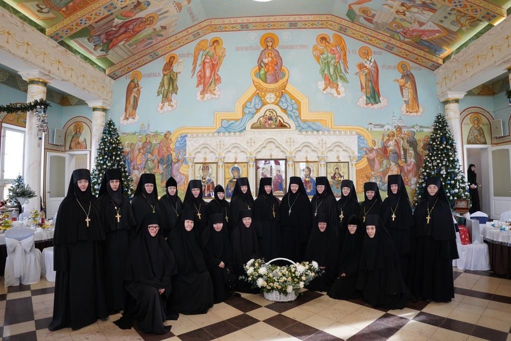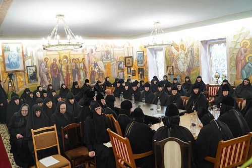 Круглый стол начался с молитвы за Божественной литургией. В храме вместе с настоятельницей Свято-Никольского Черноостровского женского монастыря игуменией Николаей (Ильиной) с сестрами молились: настоятельница Спасо-Преображенского женского монастыря на Угре игумения Анастасия (Мордмиллович), настоятельница Свято-Алексиевского женского монастыря Саратовской епархии игумения Феодосия (Бессонова) с сестрами, настоятельница подворья Свято-Успенского женского монастыря в поселке Новоискитимск Кемеровской епархии игумения Михаила (Файзулина), настоятельница Богородице-Рождественсокого женского монастыря в Тюмени игумения Нина (Схулухия), настоятельница Серафимо-Покровского женского монастыря в городе Ленинск-Кузнецкий игумения Нектария (Седова) с сестрами, настоятельница Вольского Владимирского женского монастыря Саратовской епархии игумения Макария (Семенова), настоятельница Свято-Николаевского женского монастыря «Святые пещеры» в селе Покровка Оренбургской епархии игумения Иоанна (Боярская), настоятельница женского монастыря в честь Калужской иконы Божией Матери игумения Параскева (Ляхова) с сестрами, настоятельница Свято-Успенского женского монастыря в селе Елыкаево Кемеровской епархии игумения Стефания (Марченко), настоятельница Свято-Успенского Гремячева женского монастыря игумения Михаила (Осипова) с сестрами, настоятельница Казанского девичьего монастыря игумения Ангелина (Петрова) с сестрами, настоятельница Свято-Успенского женского монастыря города Энгельса (Покровска) Саратовской епархии игумения Георгия (Кузенкова), настоятельница Свято-Успенского Шаровкина женского монастыря – подворья Свято-Никольского Черноостровского женского монастыря монахиня Елисавета (Воробьева) с сестрами, настоятельница Свято-Троицкого Иссык-Кульского женского монастыря монахиня Анна (Стэльмах), настоятельница Свято-Троицкого Симферопольского женского монастыря монахиня Евфросиния (Вислова), настоятельница Архиерейского подворья бывшего Свято-Вознесенского Козельского женского монастыря монахиня Вероника (Абрамова), настоятельница Архиерейского подворья Калужской епархии в селе Рождествено монахиня Спиридона (Свинарева) с сестрами, настоятельница Свято-Успенского скита в селе Серебряно Калужской епархии монахиня Феофания (Евдокимова). Также с ними молилась гостья обители настоятельница женского монастыря в честь Святых Жен-Мироносиц Бобруйской епархии игумения Параскева (Ельская) с сестрами.