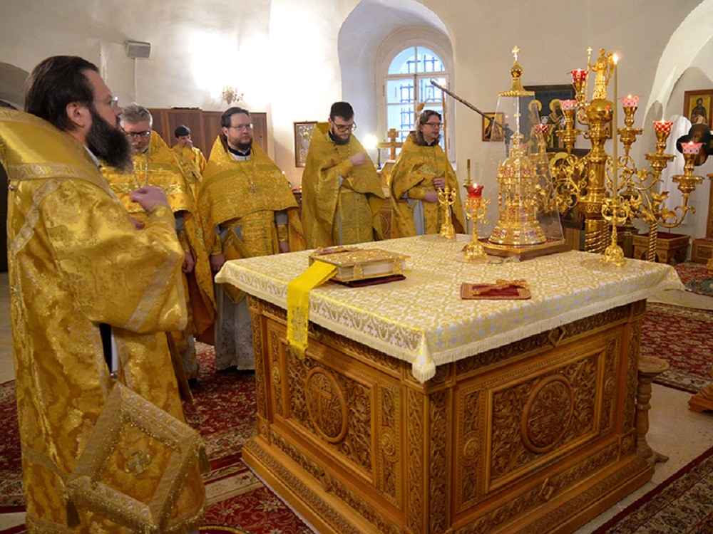 За Божественной литургией Его Высокопреосвященству сослужили наместник обители игумен Николай (Золотов), председатель Церковного суда Смоленской епархии игумен Тарасий (Ланге), заведующий кафедрой богословия и церковно-исторических дисциплин Смоленской православной духовной семинарии иеромонах Рафаил (Ивочкин), братия и духовенство монастыря.