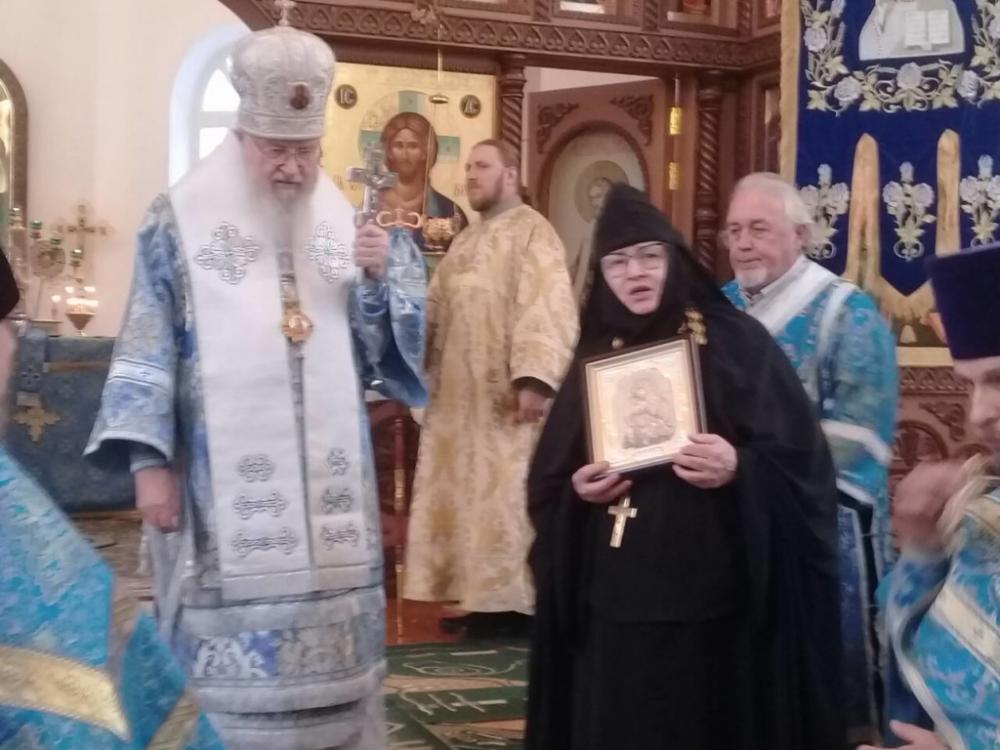 В заключение игумения Афанасия (Воловик), настоятельница Свято-Знаменского женского монастыря, преподнесла митрополиту Евлогию в дар икону Божией Матери «Милостивая».