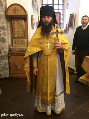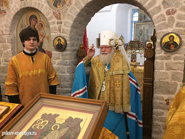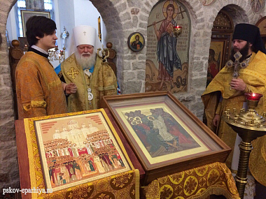 По отпусте Божественной литургии Владыка митрополит возглавил праздничный молебен, по окончании которого прочел молитву Всеблагому Господу, испрашивая Его помощи и благословения на труды новоназначенного настоятеля обители иеромонаха Серафима. Также псковский архипастырь прочел молитву прославляемому в этот день святителю Агафангелу, послу чего было пропето праздничное величание.