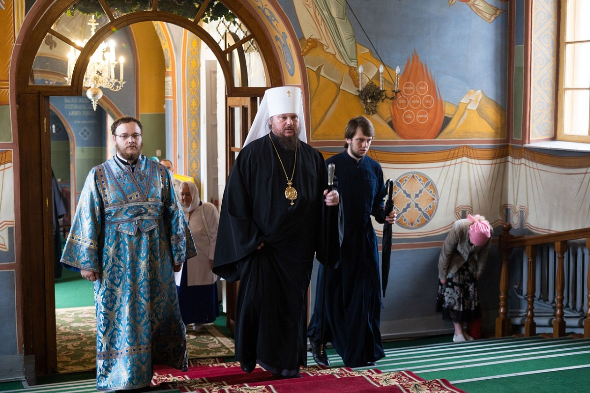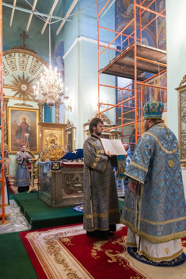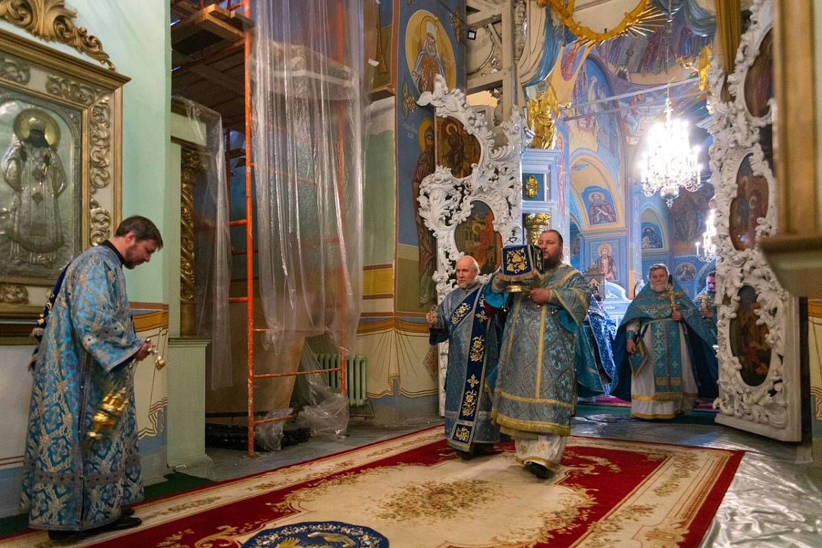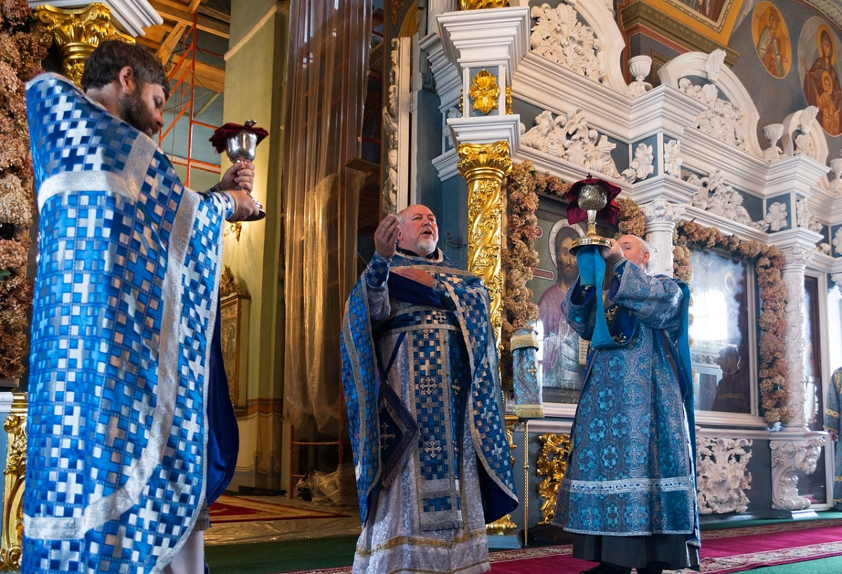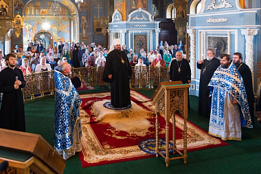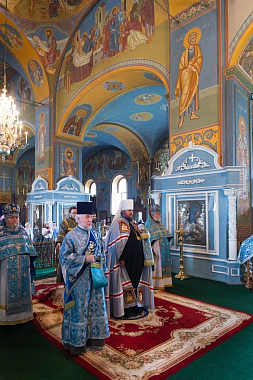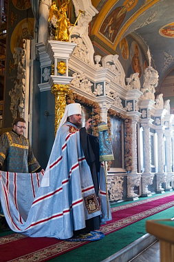 За Божественной литургией в Богоявленском соборе Его Высокопреосвященству сослужили протоиереи Валерий Бунтеев, Петр Бахтин и Иоанн Чулков, духовенство кафедрального собора.