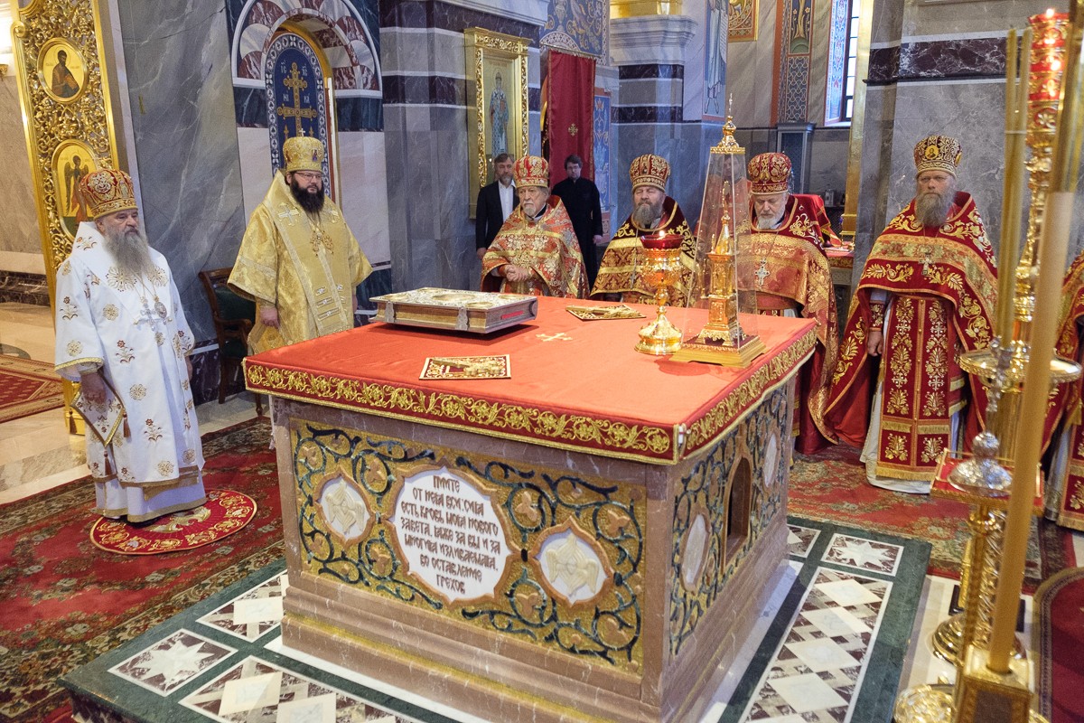 Матушка София поблагодарила митрополита Варсонофия и преподнесла в дар Его Высокопреосвященству крест и панагию. «Мы молились больше пятнадцати лет, чтобы храм этот был восстановлен, – сказала настоятельница. – Храм пережил пожар. То, что мы видим сейчас, это молитва и труд многих людей, в том числе наших прихожан».