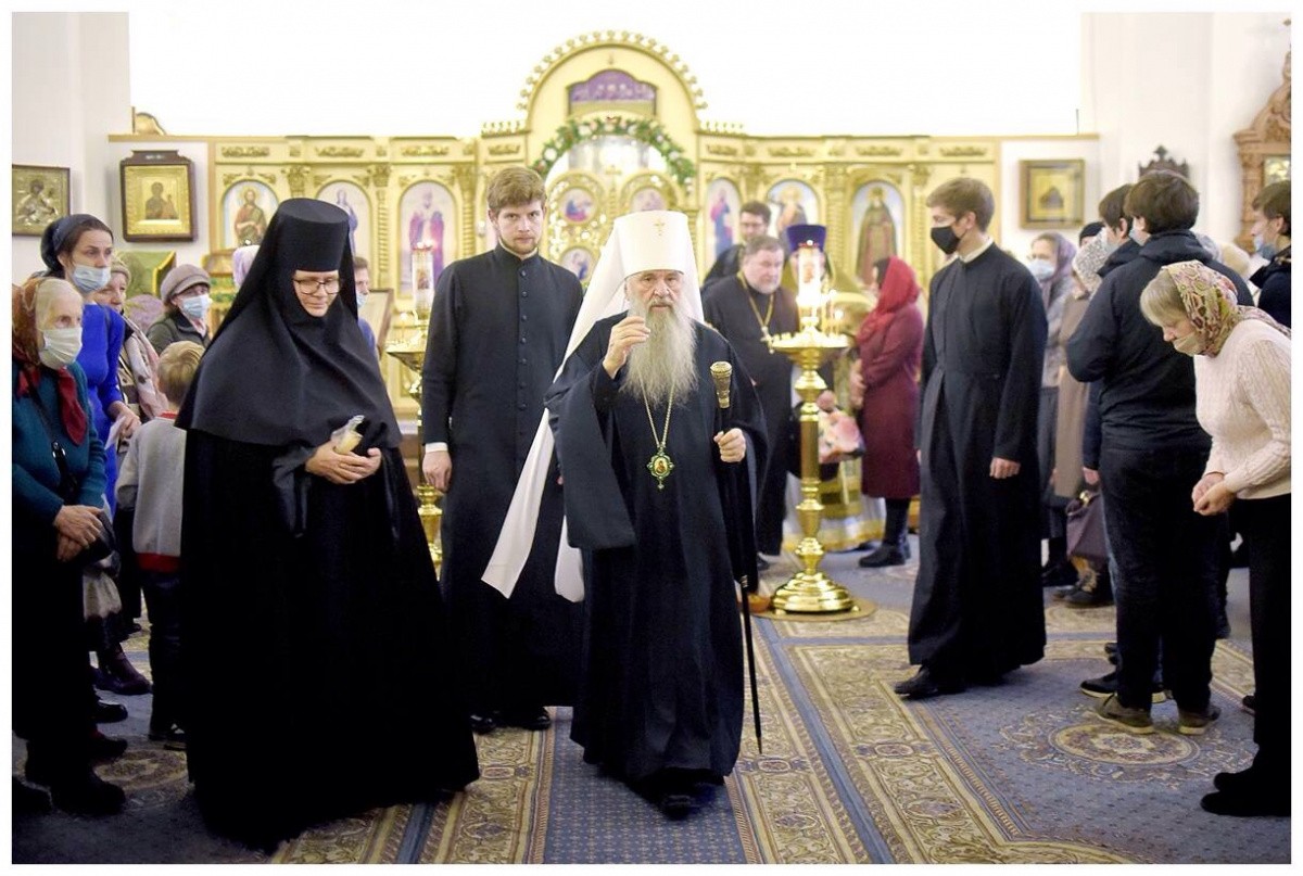 Матушка Евфросиния поблагодарила правящего архиерея за совместную молитву и преподнесла ему икону праведного Иоанна Кронштадтского с частицей его облачения, изготовленную в иконописной мастерской храма.