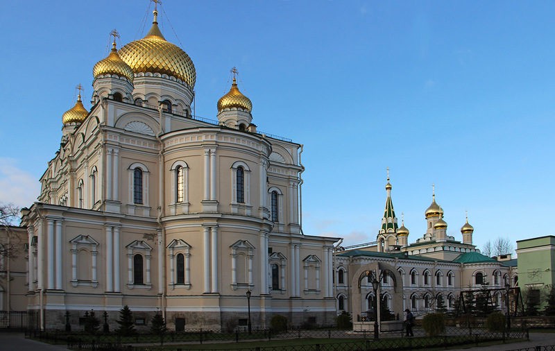 Собор Воскресения Словущего был заложен в 1849 году в присутствии императора Николая I. Построен по проекту Николая Ефимова и Николая Сычева в русско-византийском стиле. 2 июля 1861 года был освящен главный престол. В 1932 году президиум Московского райсовета ходатайствовал о сносе собора. Этому помешала просьба потребсоюза о передаче здания универмагу. Храм был закрыт, но универмаг так и не открыли. Собор разграбили, колокольню взорвали. После передачи Церкви осенью 2001 года храмов и зданий монастырского комплекса началось восстановление святыни. В декабре 2006 года освящены малые купола, в марте 2007-го – центральные купол и крест. Внутреннее убранство воссоздано целиком. 18 ноября 2018 года митрополит Санкт-Петербургский и Ладожский Варсонофий освятил храм малым чином, 31 мая 2019 года Святейший Патриарх Кирилл совершил великое освящение собора.