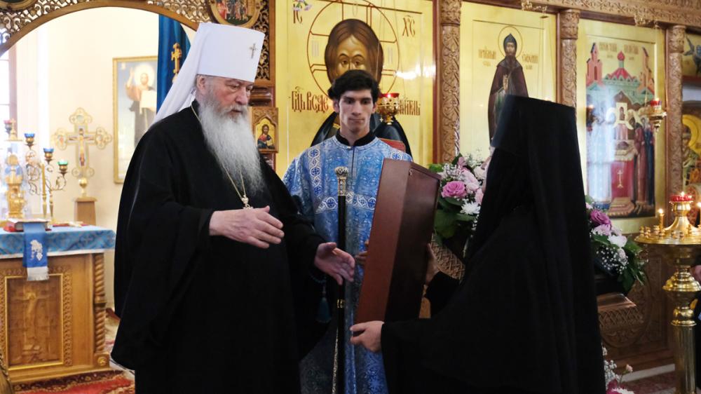Настоятельница Ризоположенского монастыря игумения Екатерина поблагодарила главу Владимирской митрополии за посещение обители в день престольного праздника и преподнесла ему в дар Влахернскую икону Пресвятой Богородицы, один из дней празднования которой приходится на 15 июля.