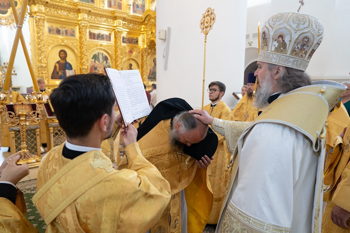На малом входе в соответствии с решением Священного Синода владыка Амвросий возвел иеромонаха Андроника (Живогляда) в сан игумена и вручил ему игуменский жезл.