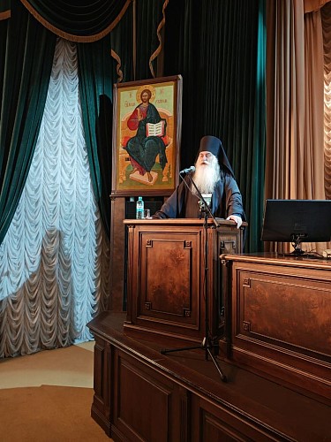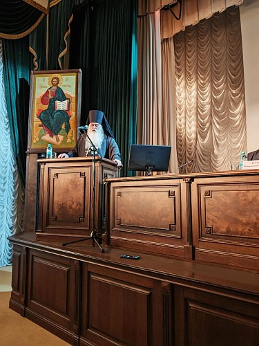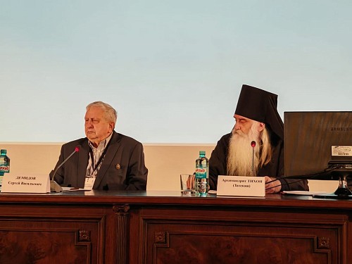 Архимандрит Тихон огласил приветственное слово митрополита Нижегородского и Арзамасского Георгия к участникам симпозиума:
