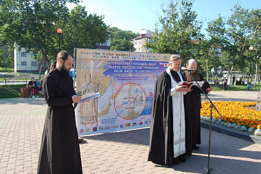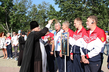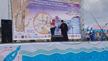 «Святитель Николай Японский положил начало дружбе между народами, молясь и за русских христиан, и за японских в самые трудные периоды отношений между государствами. Сегодня утром, – продолжил свое слово игумен Серафим, – спортсмены посетили храм Рождества Христова в Южно-Сахалинске. Будет правильно и глубоко символично, если, достигнув берегов Японии, Вы посетите храм Воскресения Христова в Хокодатэ, построенного усилиями Николая-До – святителя Николая Японского, поблагодарив Бога и святителя Николая». Пожелав спортсменам силы воли и крепости духа, игумен Серафим закончил слово напутствием: «Побеждает всегда любовь и дружба. Пусть дружба между народами крепнет, а такие мероприятия, объединяющие народы, проходят чаще. С Богом, друзья, в добрый путь!»