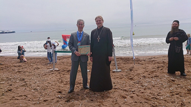 Настоятель и братия Свято-Покровского мужского града Корсакова монастыря молитвенно поддержали спортсменов-участников заплыва «Навстречу солнцу и дружбе: от березки до сакуры»