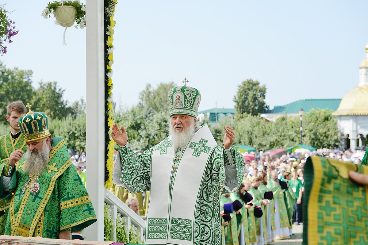 Предстоятель Русской Православной Церкви возглавил служение Божественной литургии под открытым небом на Преображенской площади монастыря у раки с честными мощами преподобного Серафима, принесенными перед началом богослужения из Свято-Троицкого собора и поставленными за Престолом.