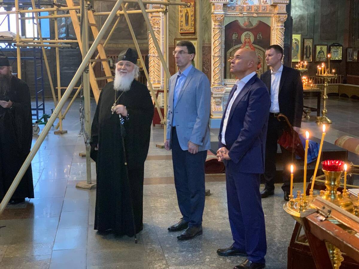 Игорь Олегович и Игорь Георгиевич вместе с супругами помолились у раки со святыми мощами Святителя. Для почетных гостей была проведена обзорная экскурсия по территории обители, ими был осмотрен храм, святителя Тихона, построенный на месте его бывшей келии.