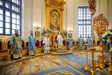 По окончании Литургии Святейший Патриарх Кирилл и архиереи, участвовавшие в богослужении, возложили цветы на могилу митрополита Феофана (Ашуркова; 21 мая 1947 г. – 20 ноября 2020 г.), которая находится за алтарем Казанского собора, и пропели «Вечную память» приснопамятному архипастырю.