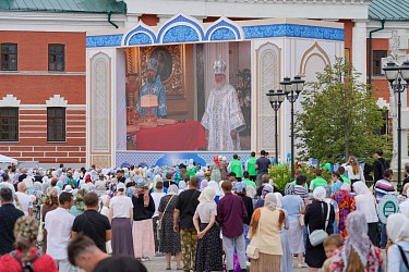 Митрополит Казанский и Татарстанский Кирилл от лица архиереев, духовенства и верующих Татарстанской митрополии приветствовал Святейшего Владыку и преподнес в дар Его Святейшеству старинный Казанский образ Божией Матери, украшенный сестрами Казанского Богородицкого женского монастыря.