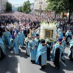 Под колокольный звон из собора вынесли икону Божией Матери «Знамение» Курскую-Коренную. Владыка Герман благословил святым образом Богородицы Курск на четыре стороны света, и многотысячное шествие начало свой путь по центру города к Введенскому храму.