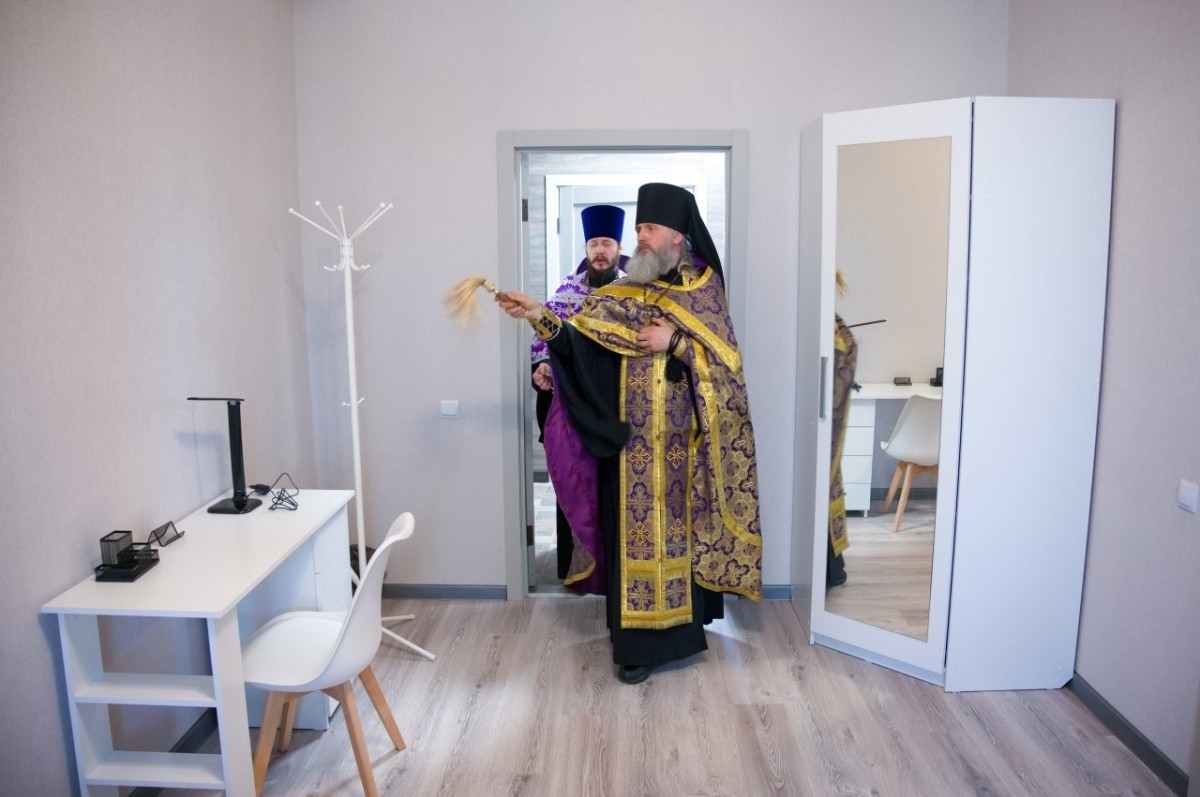 Чин освящения совершил благочинный монастырей Брянской епархии игумен Даниил (Цупиков) в сослужении клириков обители иерея Димитрия Алексашкина и иерея Антония Козлова. После освящения воды и елея священнослужители окропили комнаты центра святой водой.
