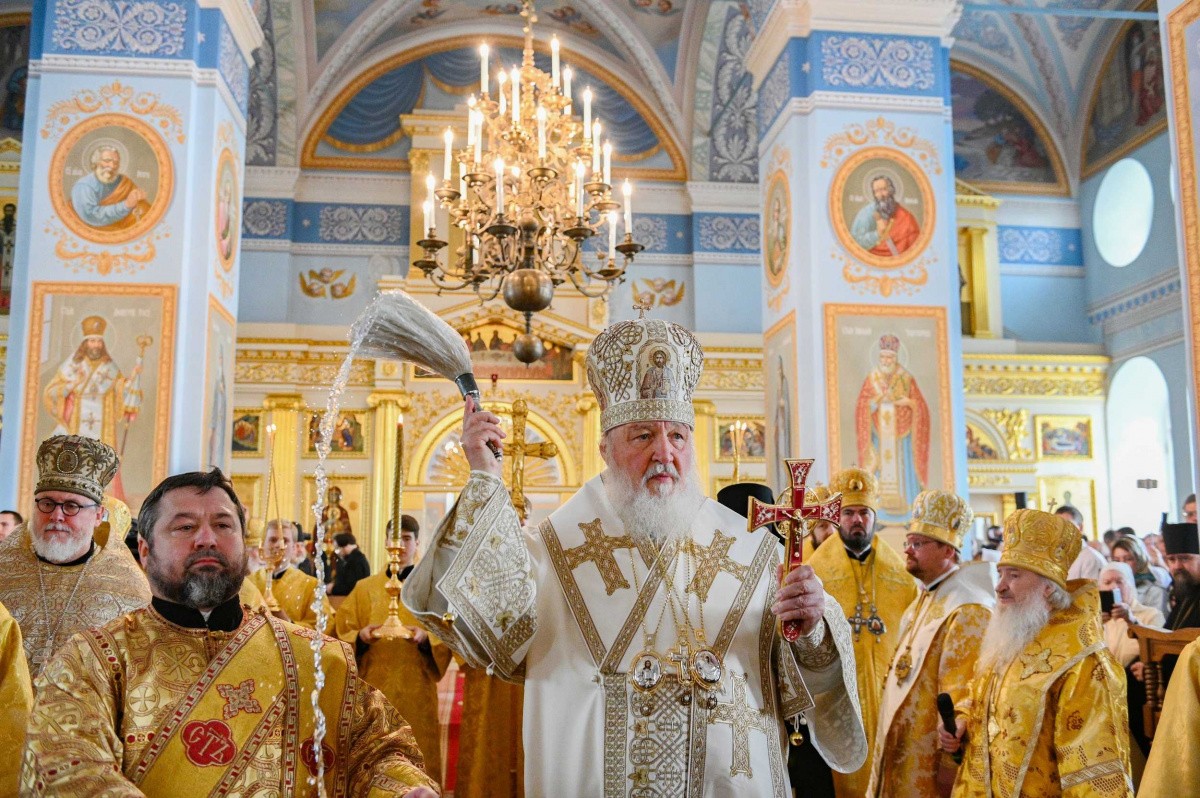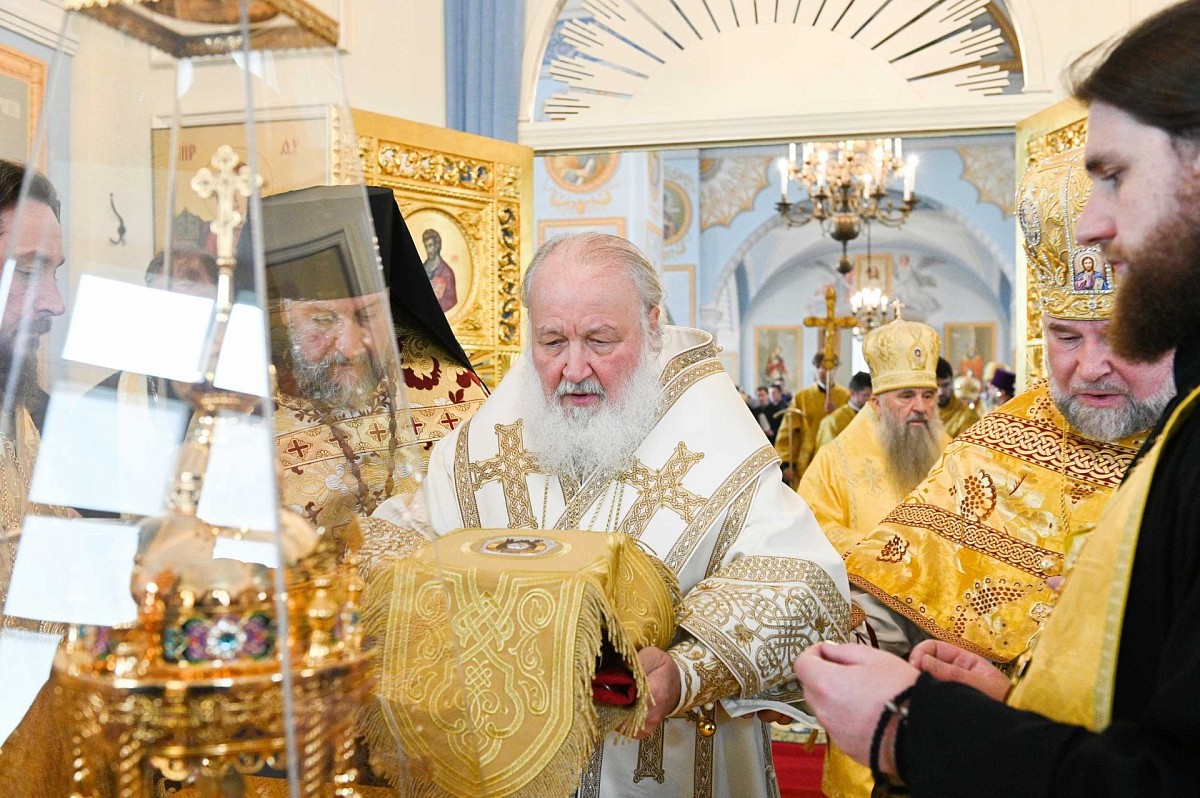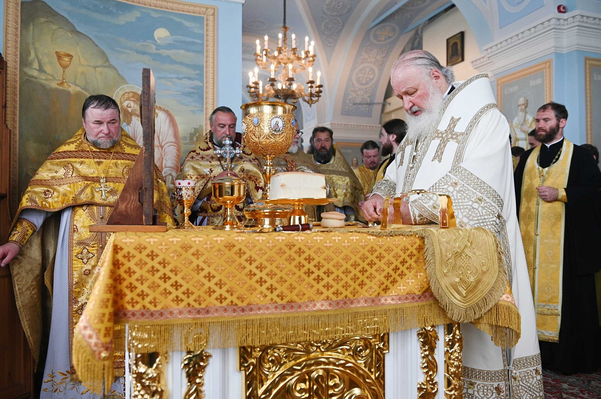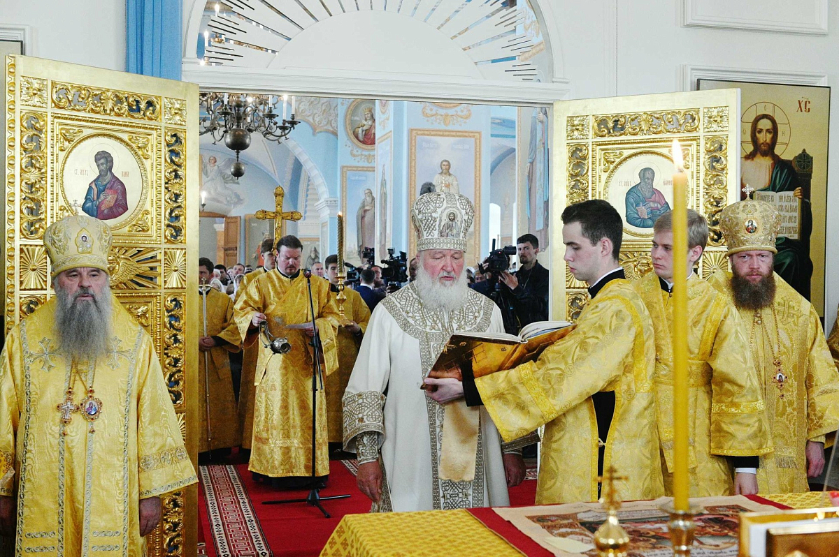 Затем Предстоятель Русской Православной Церкви совершил чин великого освящения верхнего храма собора Рождества Пресвятой Богородицы и Божественную литургию в новоосвященном храме.