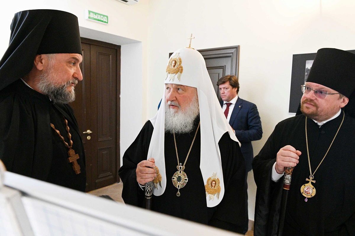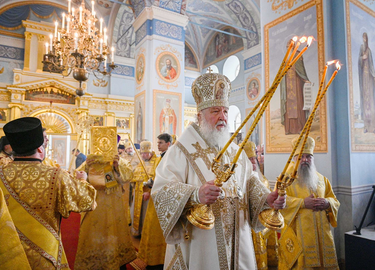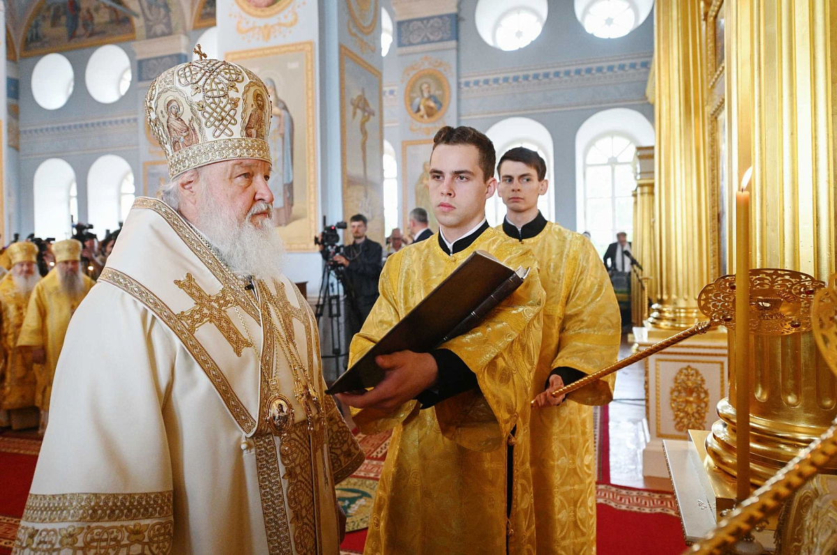 Затем Предстоятель Русской Православной Церкви совершил чин великого освящения верхнего храма собора Рождества Пресвятой Богородицы и Божественную литургию в новоосвященном храме.