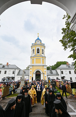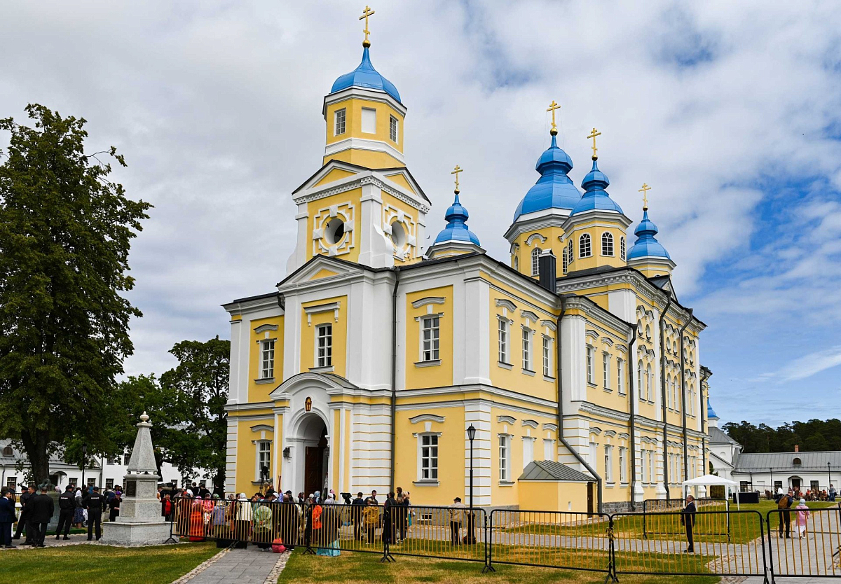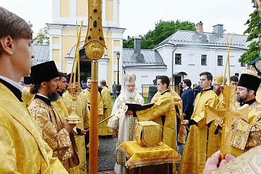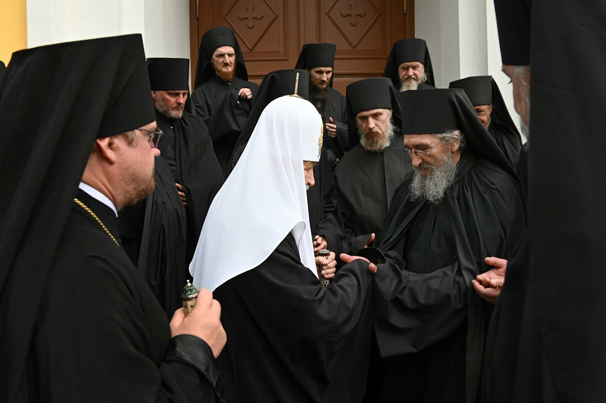 У святых врат монастыря Святейшего Владыку встречали священноархимандрит Коневского Рождество-Богородичного монастыря епископ Выборгский и Приозерский Игнатий, секретарь епархиального управления Санкт-Петербургской митрополии протоиерей Сергий Куксевич, наместник монастыря игумен Александр (Арва) и братия обители, представители руководства Ленинградской области и Санкт-Петербурга.