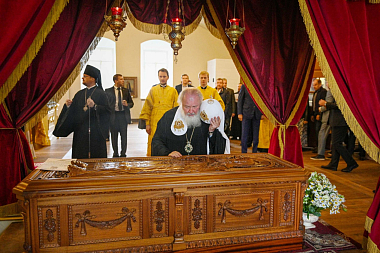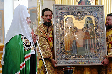 По окончании богослужения священноархимандрит Коневского Рождество-Богородичного монастыря епископ Выборгский и Приозерский Игнатий приветствовал Предстоятеля Русской Церкви и преподнес Его Святейшеству список Коневской иконы Божией Матери.
