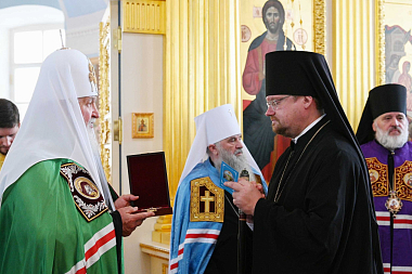 Затем Святейший Патриарх вручил церковные награды благотворителям, принимавшим участие в реставрации Коневского Рождество-Богородичного монастыря.
