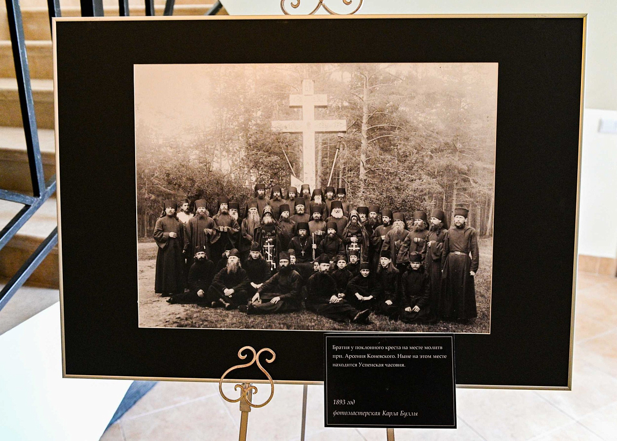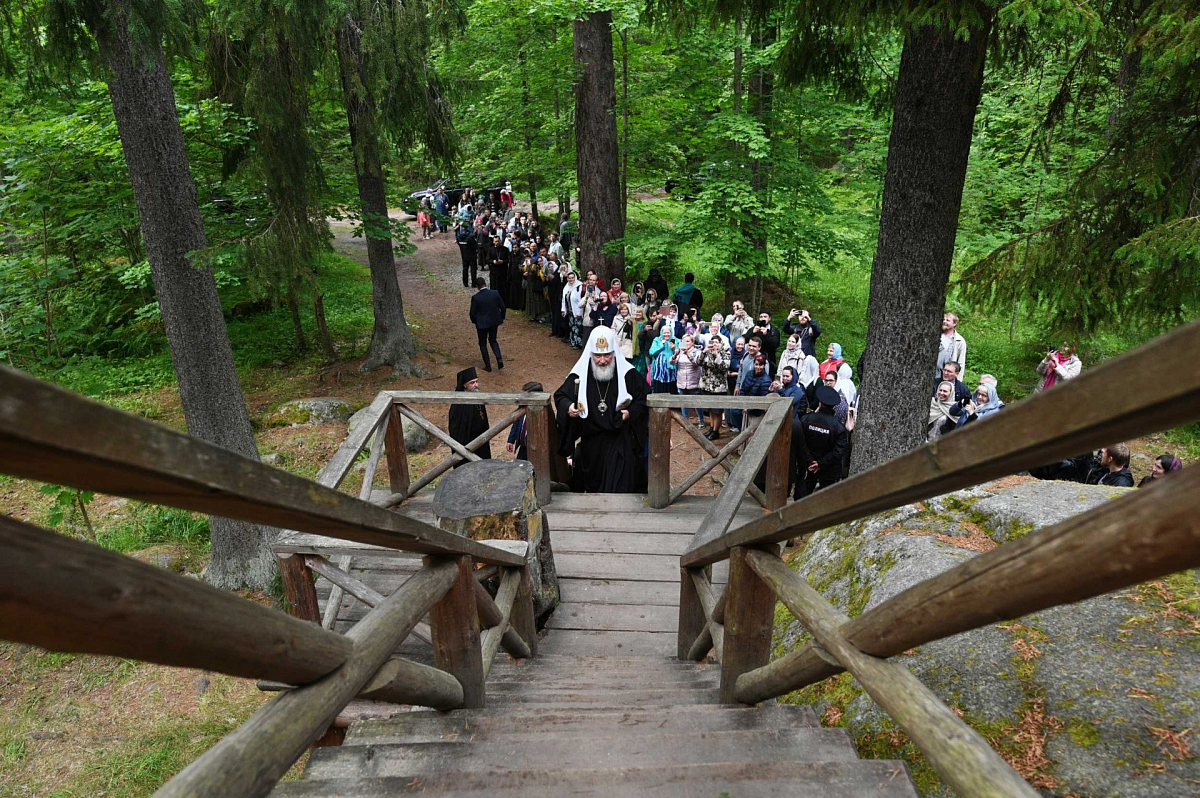 Затем Святейший Владыка посетил часовню преподобного Арсения Коневского, установленную на Конь-камне – месте древнего финно-угорского святилища. В часовне был пропет тропарь преподобному.