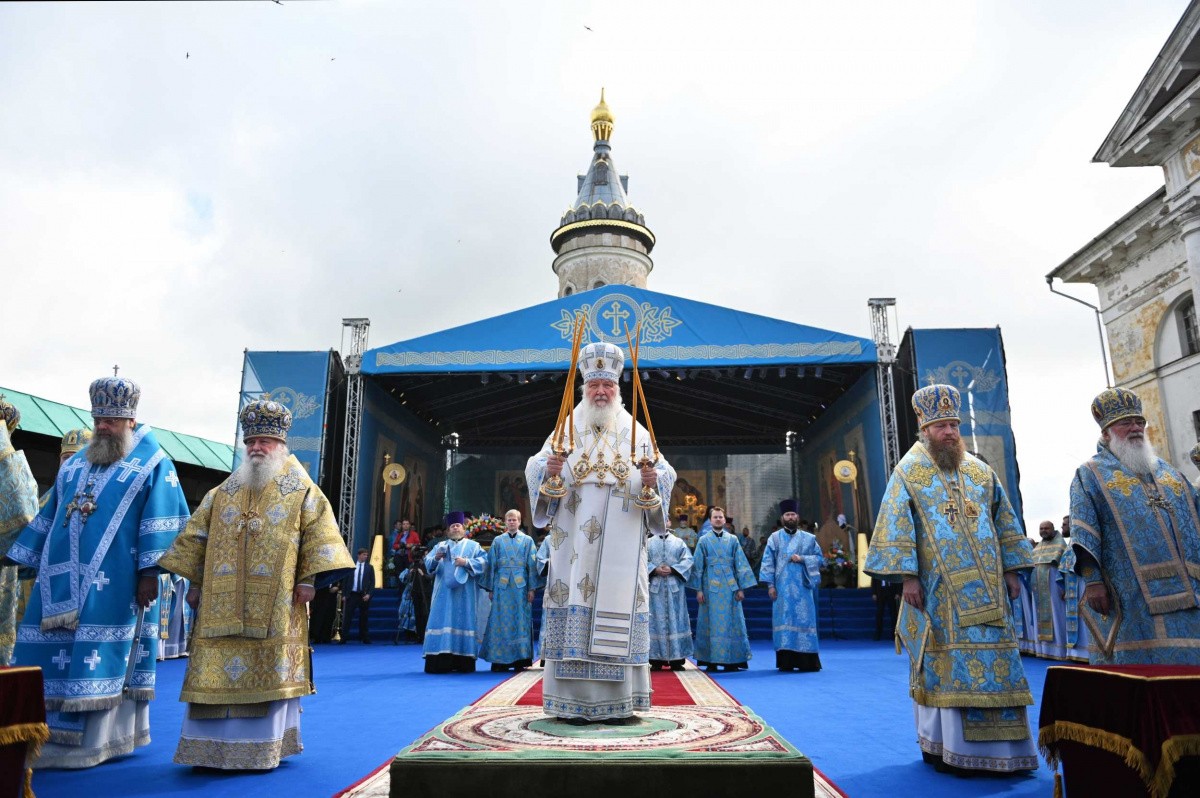 На монастырской площади Святейший Патриарх Кирилл совершил Божественную литургию у престола, установленного под временной сенью близ Борисоглебского собора.