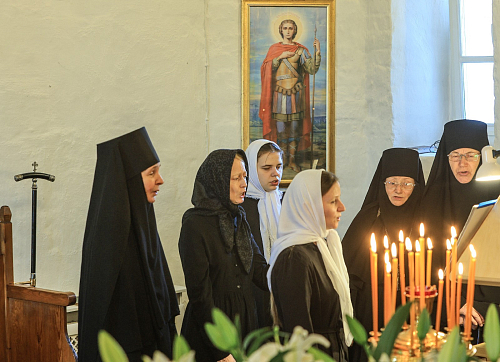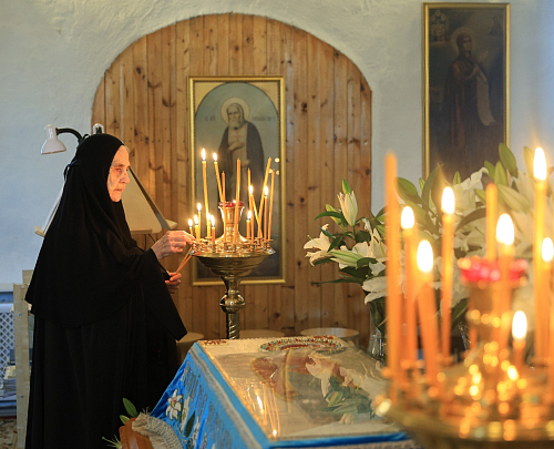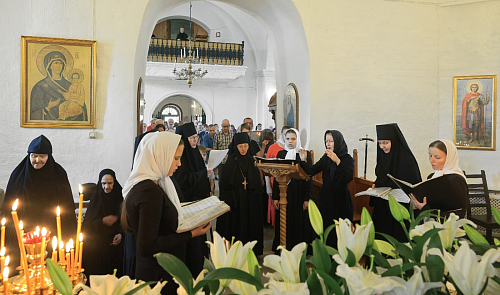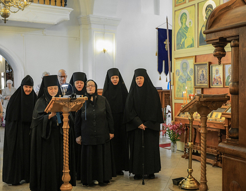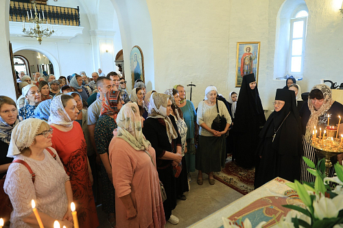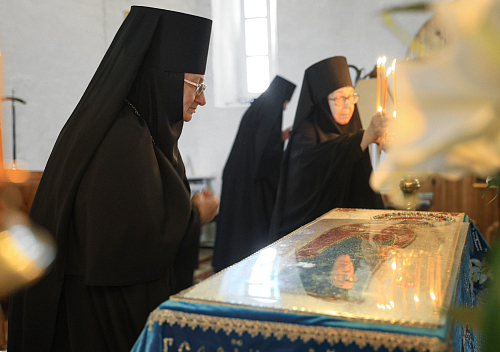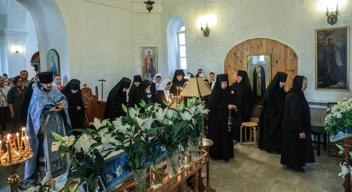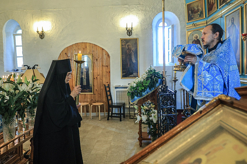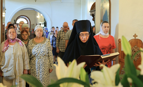 Перед началом богослужения настоятельница монастыря игумения Екатерина (Варфоломеева) с сестрами прочитали акафист Успению Божией Матери.