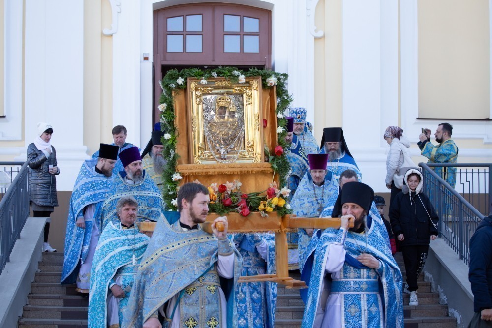 По окончании Литургии духовенство, монашествующие и паломники под звон колоколов прошли крестным ходом вокруг собора с иконой Божией Матери «Юровичская-Милосердная» и совершили славление праздника.